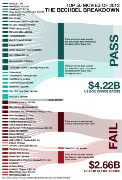 The great gift of the Bechdel Test: statistics. In this graph made by the awesome folks at Vocativ.com, we get a visual breakdown of how the 50 highest grossing films from last year fared against the Bechdel standards.
