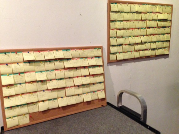 This is the plot for ‘Love is All You Need,’ with color-coded post-it notes for each interwoven plotline and event in the film.